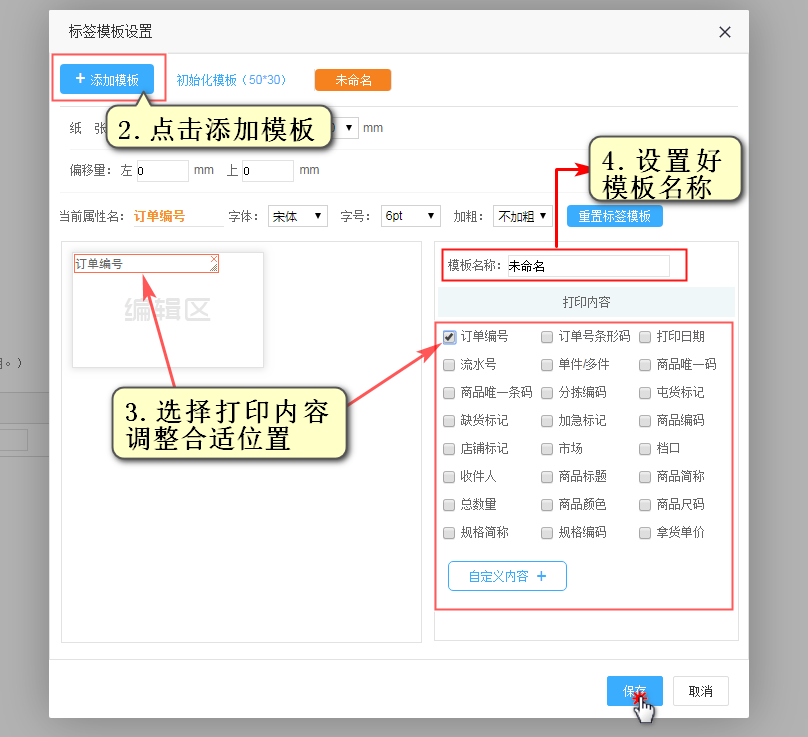 二、点击弹窗的添加模板,如图在打印内容处设置处需要打印的选项,调整合适位置,设置模板名称后保存即可