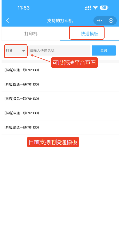 (注意:小程序添加绑定店铺成功会将店铺目前的快递模板一起同步到小程序,抖音只展示抖音平台的面单,不能打印抖店订单的其他平台模板会隐藏)