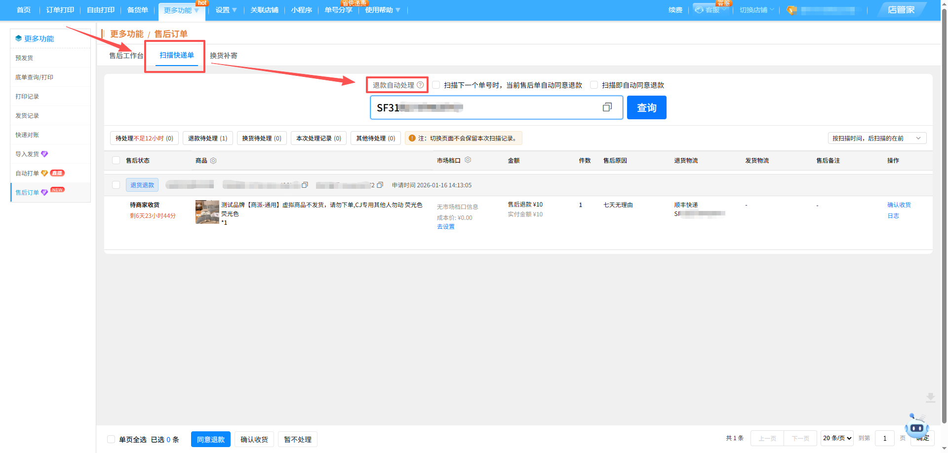-在店管家,您可使用【扫描快递单】,仅需扫描售后订单的快递单,即可做到【扫描即处理】,省事又省力!