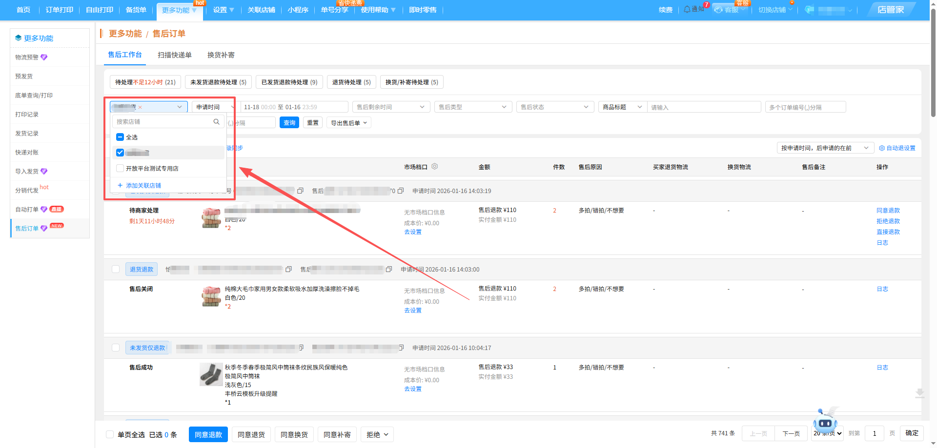 -在店管家,仅需选择您需要查看的店铺,即可查看同平台店铺售后订单信息!