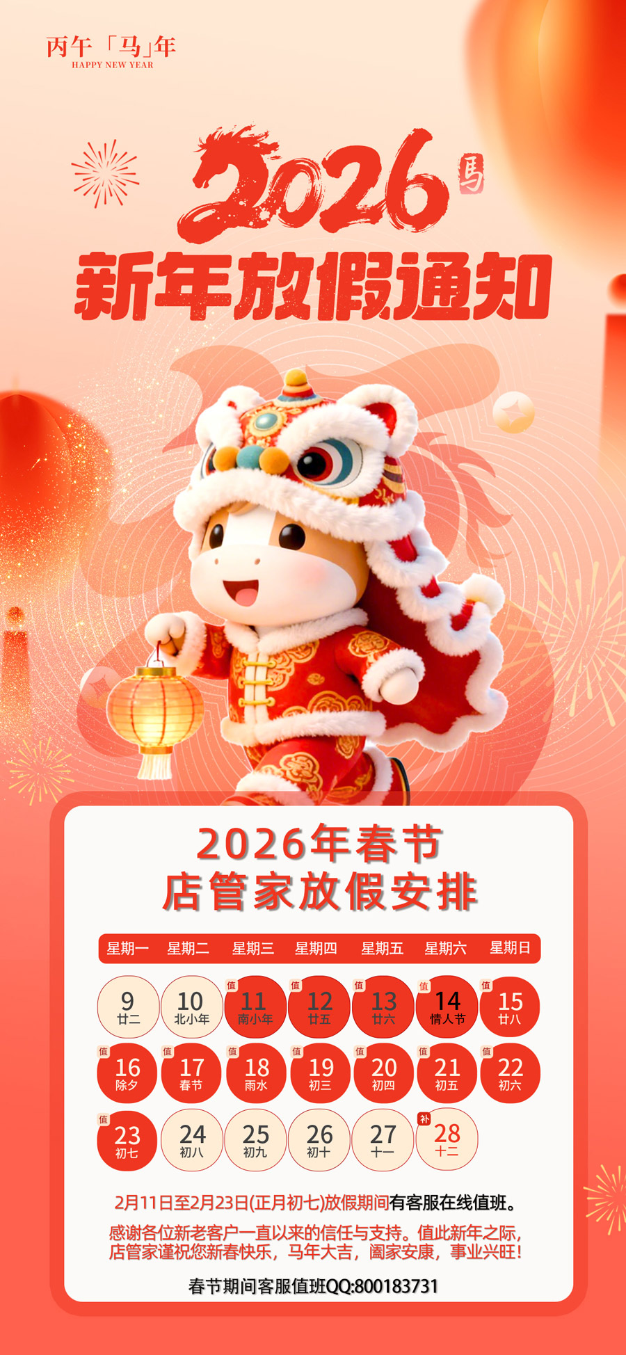 现将2026年春节店管家放假安排和客服值班时间公布如下,敬请知悉!(放假期间有客服值班)