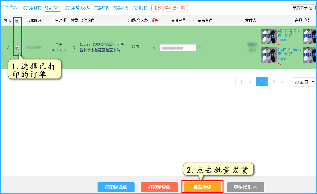 第五步:确认好订单后,选择已打印的订单,点击批量发货即可完成订单发货,单号会同步至店铺后台。