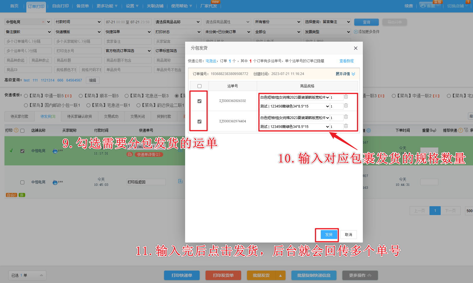 4.勾选需要分包发货出去的运单号后(注意:没有勾选的话是不会发货出去的),输入每个包裹里放的规格数量。编辑好后点击发货就会直接回传多个单号到店铺后台。