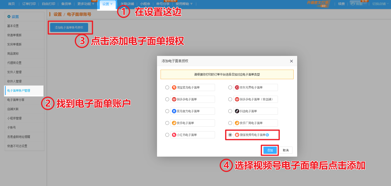 1)在店管家上方的菜单栏里找到设置-电子面单账户管理这边点击添加电子面单授权,选择视频号电子面单后点击添加。