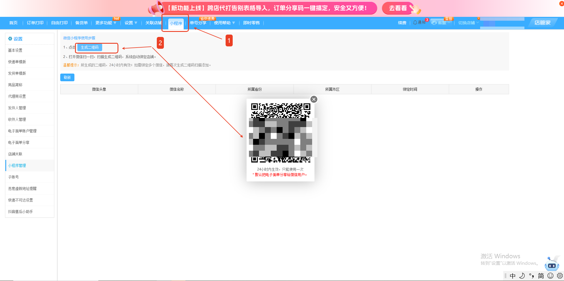1、打开店管家pc端,点击小程序,点击生成二维码;