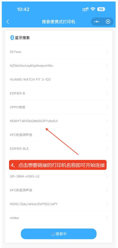 3、打开手机蓝牙和准备好的蓝牙打印机,搜索添加蓝牙打印机。按照以下步骤操作: