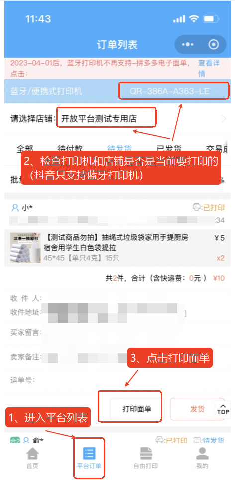 (注意:抖音订单只能使用蓝牙打印机打印;)