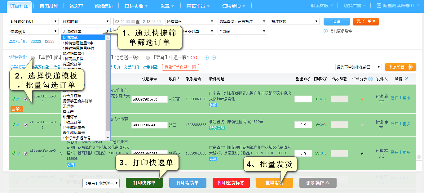 场景一:活动期间订单数量较多,商家可以筛选出哪些订单要优先打印发货的,批量打印订单,批量发货。如下图所示: