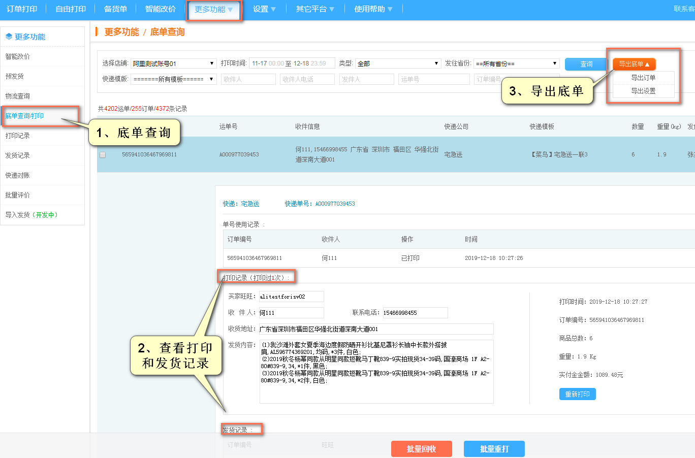 场景二:每天要打印发货那么多的订单,遇上客户问题,需要查询疑件的话,可以在底单查询中查看订单的打印记录和发货记录,随时可以重打单号,减少处理疑件的时间。如下图所示: